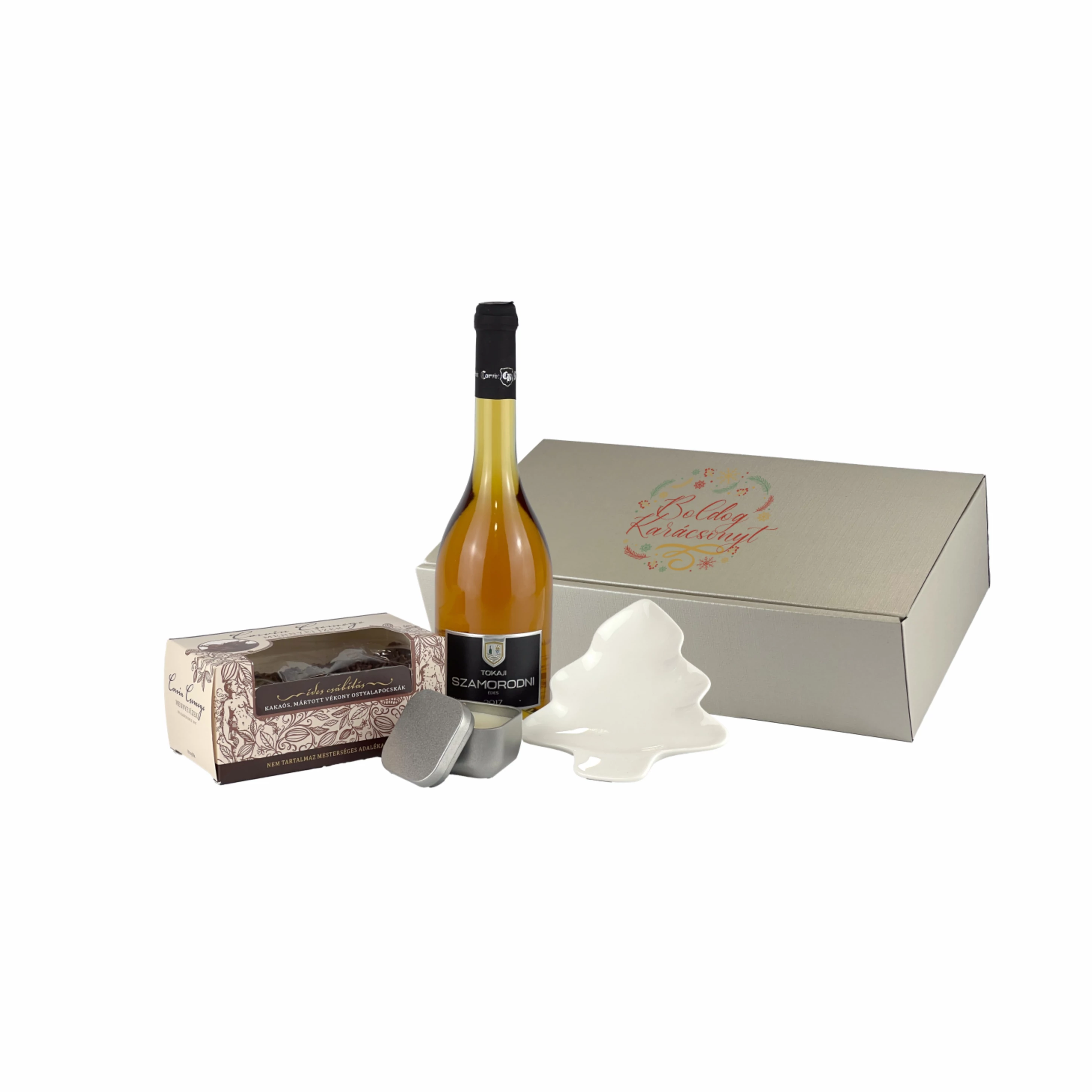 A csomag tartalma: Bézs papírdobozban, '17 Tokaji Szamorodni - édes, porcelánból készült, karácsonyi kínáló tányér (15x13 cm), vanília illatú gyertya fém tartóban, Corvin Csemege - csokoládéba mártott ostya lapok 100 g.
