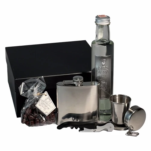 Fekete papírdobozban, 0,2l birsalma pálinka, fém flaska, rozsdamentes acélból készült összecsukható pohár tokban 70ml, fém pincérbicska dugóhúzóval és üvegnyitóval