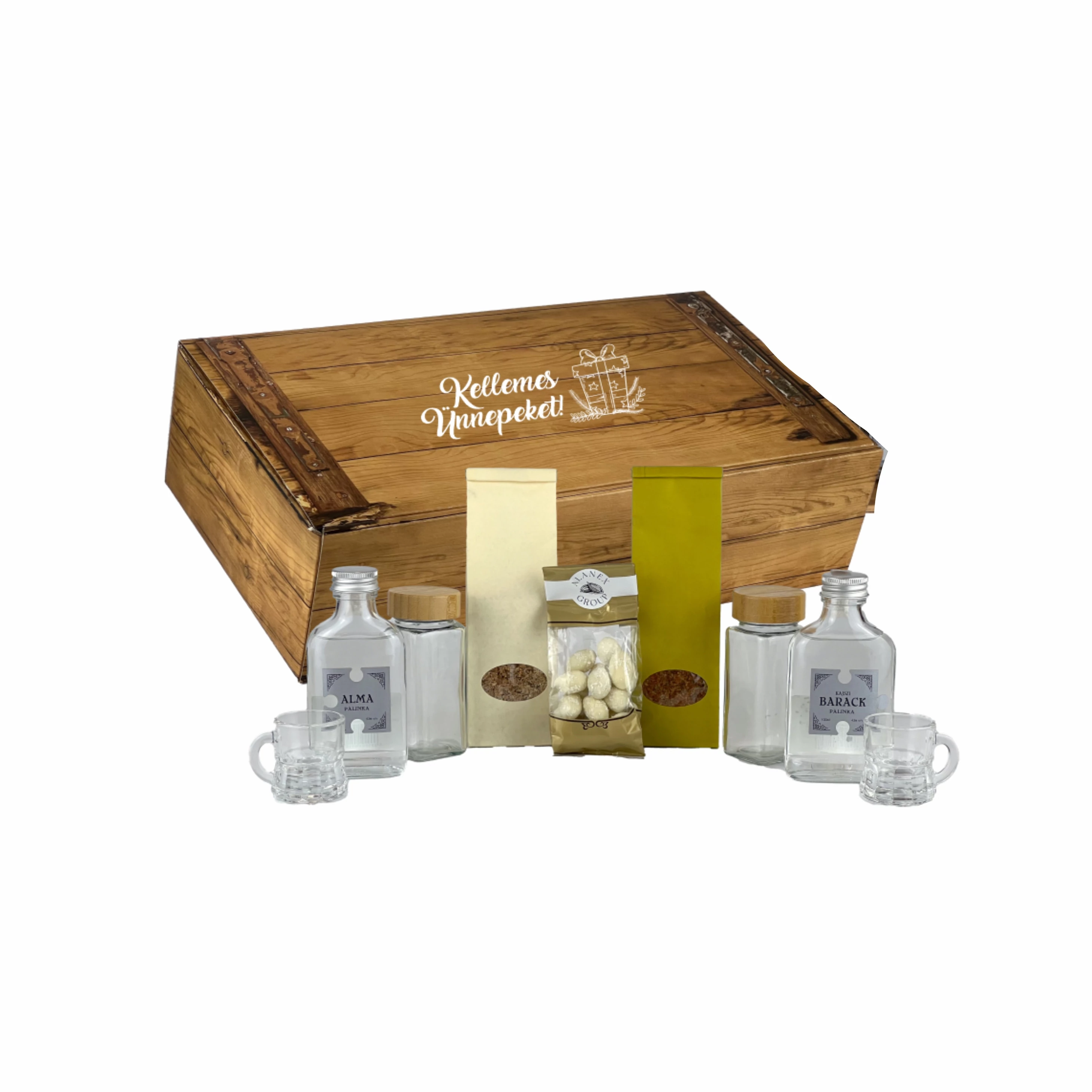 Saját üzemünkben készült kézműves finomságok, hazánk legjobb borászatainak válogatott borai, egyedi, saját gyártású fa díszdobozban.