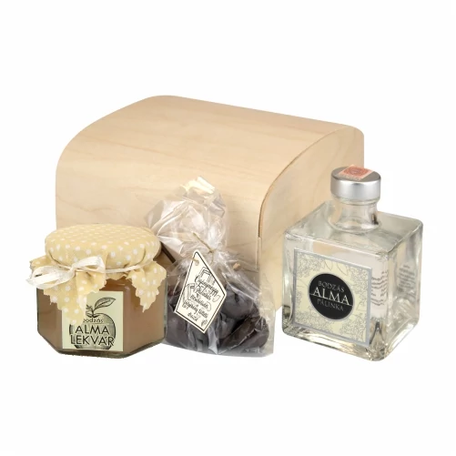 Gravírozott flexi fadobozban kocka üveges bodzás almapálinka (0,2l), kézműves bonbon csomag (60g), bodzás almalekvár (100g)