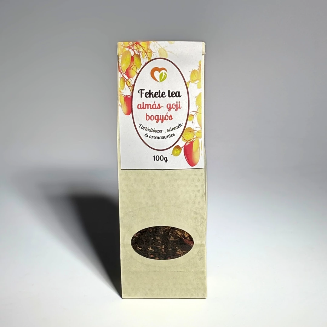 Összetevők: szálas fekete tea, goji bogyó, héjas almakocka