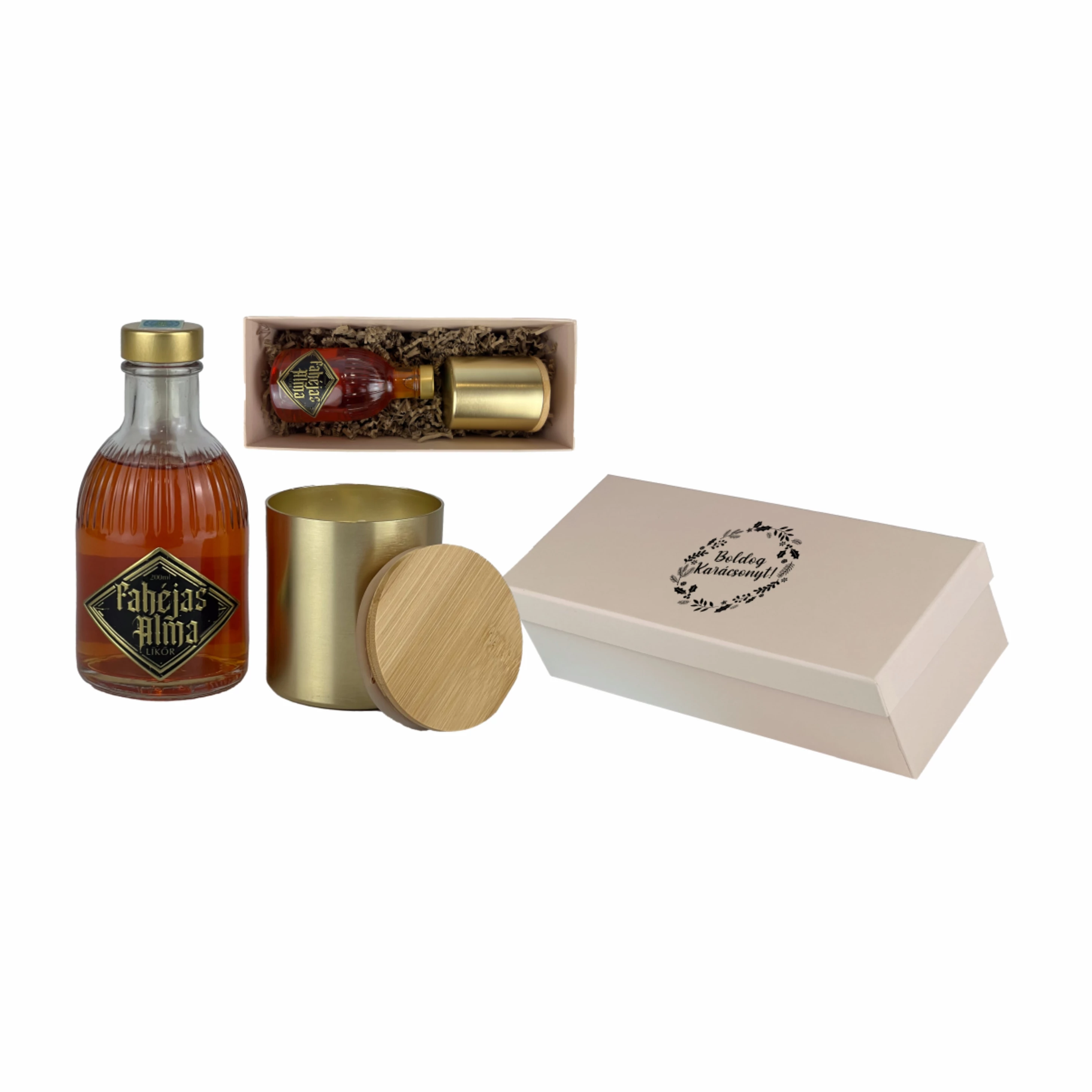 A csomag tartalma: Rózsaszín papírdobozban, 0,2 l fahéjas almalikőr, vanília illatú gyertya alumínium tartóban, bambusz tetővel.