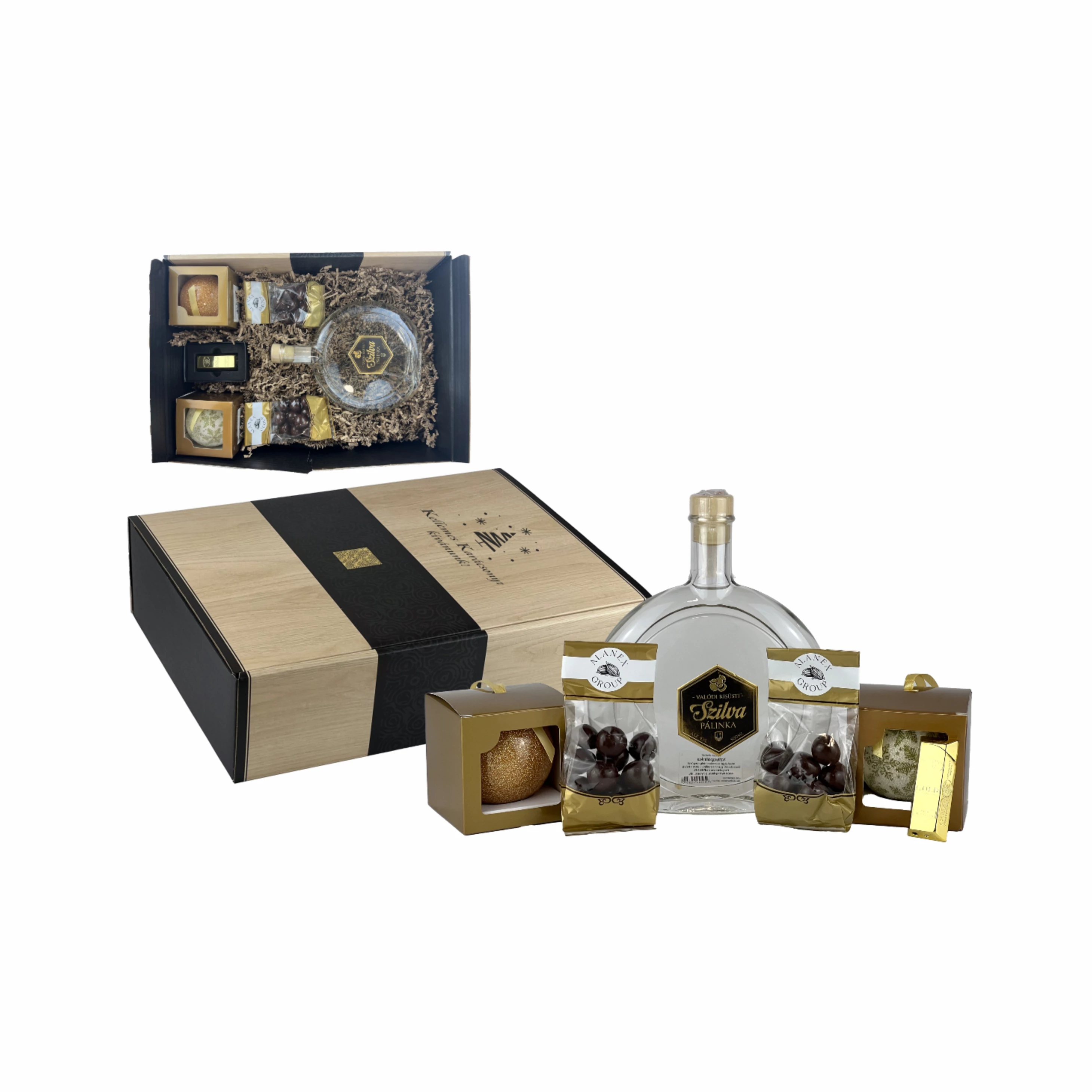 Saját üzemünkben készült kézműves finomságok, hazánk legjobb borászatainak válogatott borai, egyedi, saját gyártású fa díszdobozban.