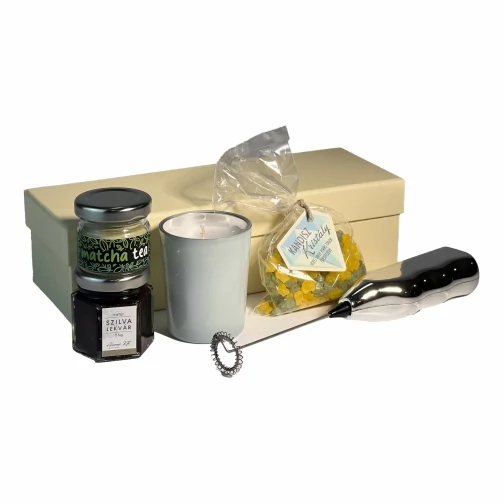 Egyedi UV-nyomtatott papírdobozban, matcha tea 15g, színes kandisz kristály, habosító, szilva lekvár 55g, illatgyertya üveg tartóban