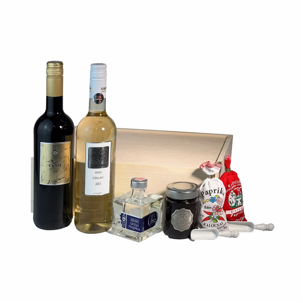 Gravírozott tolótetős fadobozban, '24 Egri csillag, '22 Villányi Cuvée, 0,2l szilva pálinka, szilva lekvár 200g, édes és csípős őrölt paprika fászer kanállal 2x50g