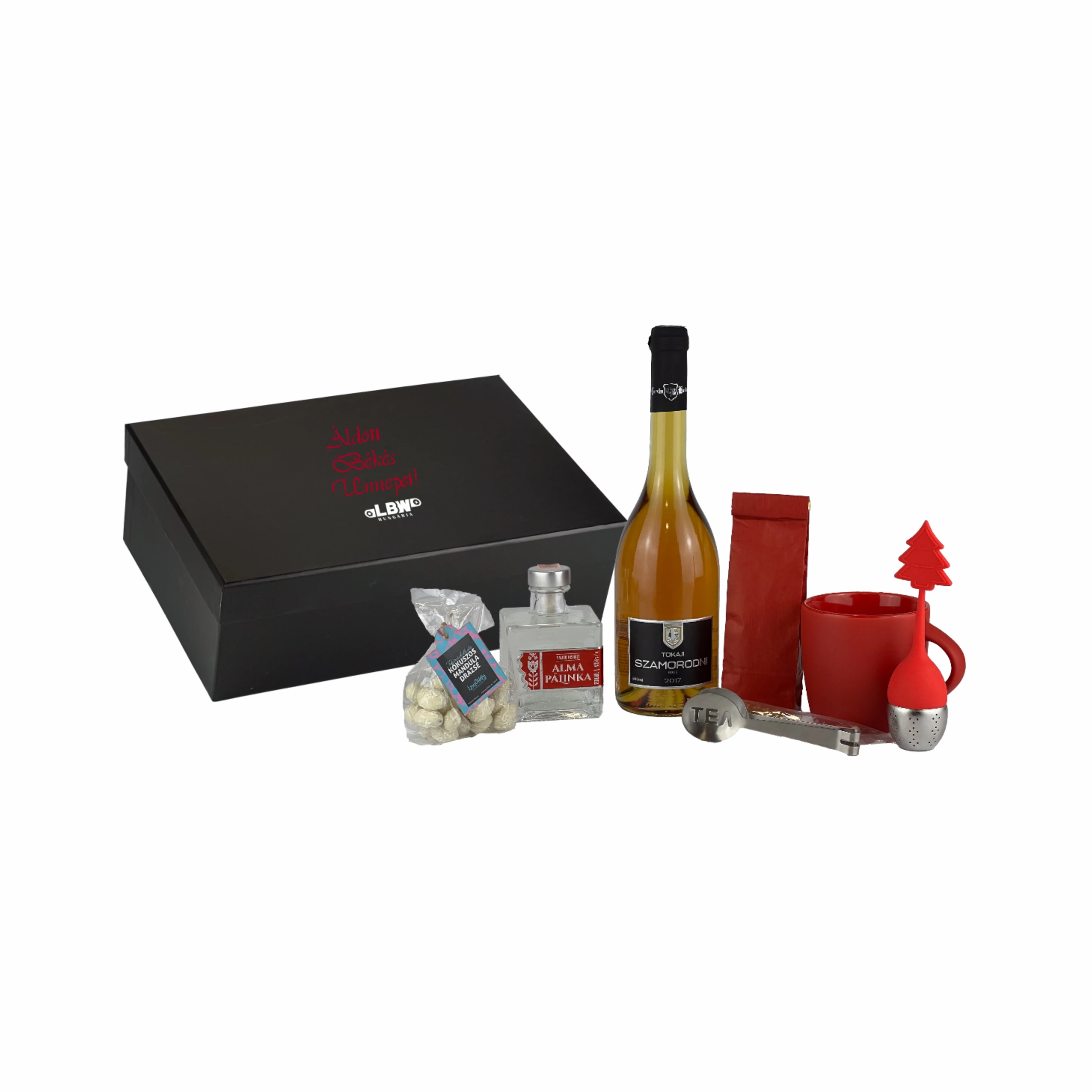 A csomag tartalma: Fekete papírdobozban, '17 Tokaji szamorodni édes, 0,2 l almapálinka, erdei gyümölcstea keverék papírtasakban, rozsdamentes acél - szilikon teatojás, fém tea csipesz, kerámia bögre kívül matt, belül fényes felülettel 300 ml, kézműves bonbonkülönlegesség 60 g.