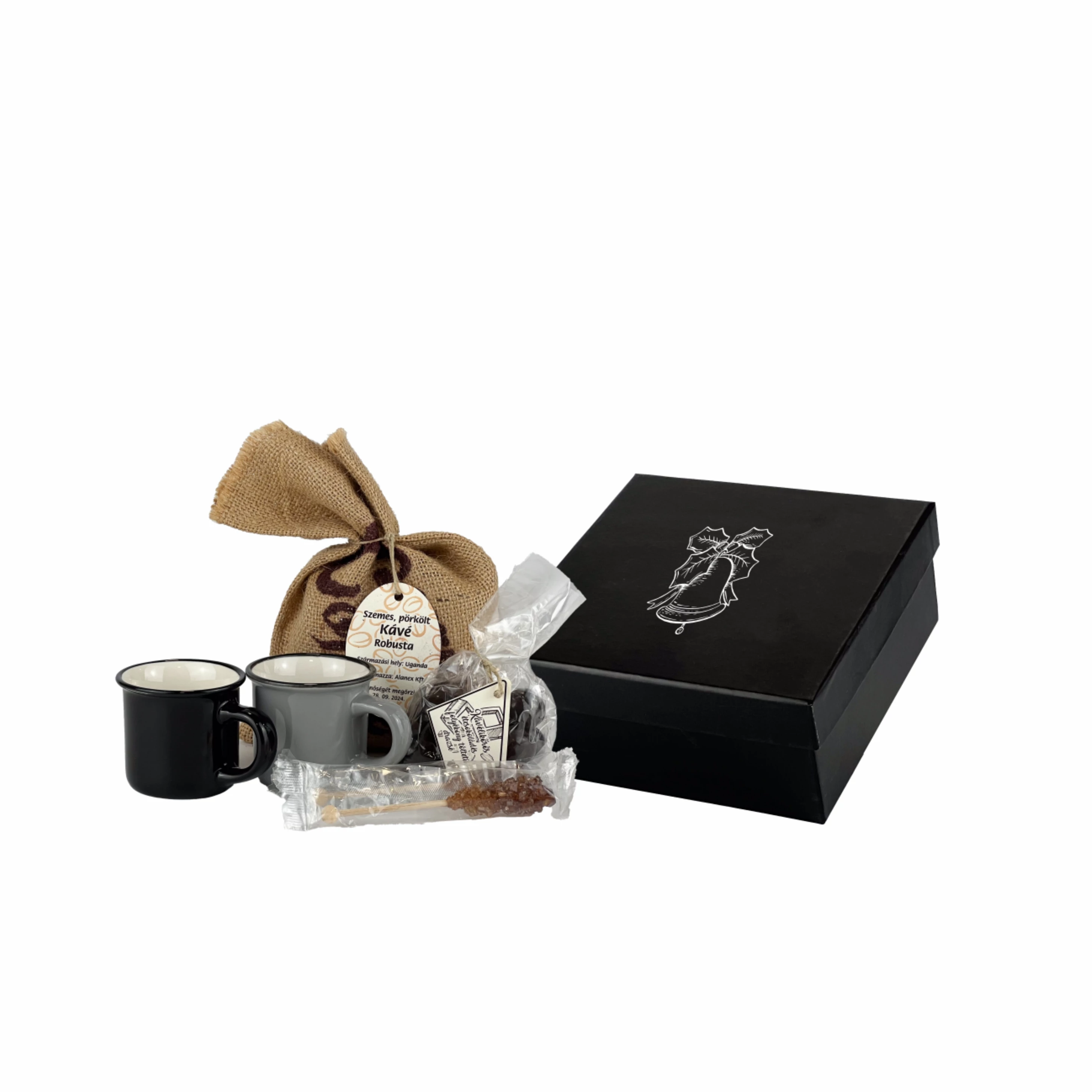 A csomag tartalma: Fekete papírdobozban, Corvin Coffee - szemes kávé különlegesség 100 g, 2 db nosztalgikus - eszpresszós kerámia bögre, fekete peremmel - 60 ml, kávélikőrös bonbon csomag 60 g, 2 db kandiszpálca.