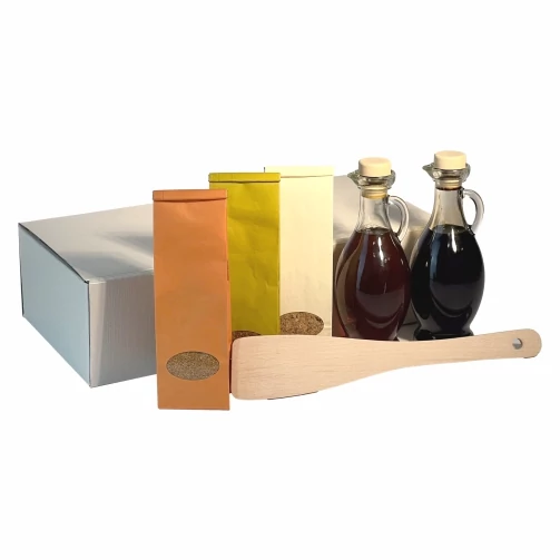 UV nyomtatott vajszínű papírdobotban, gránátalmás balzsamecet, muskotályos borecet, fakanál, 3 csomag fűszerkeverék (malacsült 120g, narancsos szárnyas 100g, hal fűszerkeverék 80g)