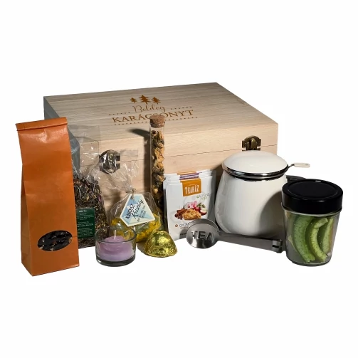 Gravírozott kapcsos fadobozban, kerámia bögre fedővel és fém szűrővel, zöld teakeverék 40g, teakeverék papírtasakban, színes kandisz kristály, filteres teacsomag 7 db, fém teacsipes, aszalt gyümölcsök üvegben (mangó, pomelo), kézműves konyakmeggy, mécses üveg tartóban, ehető perzsa rózsaszirom