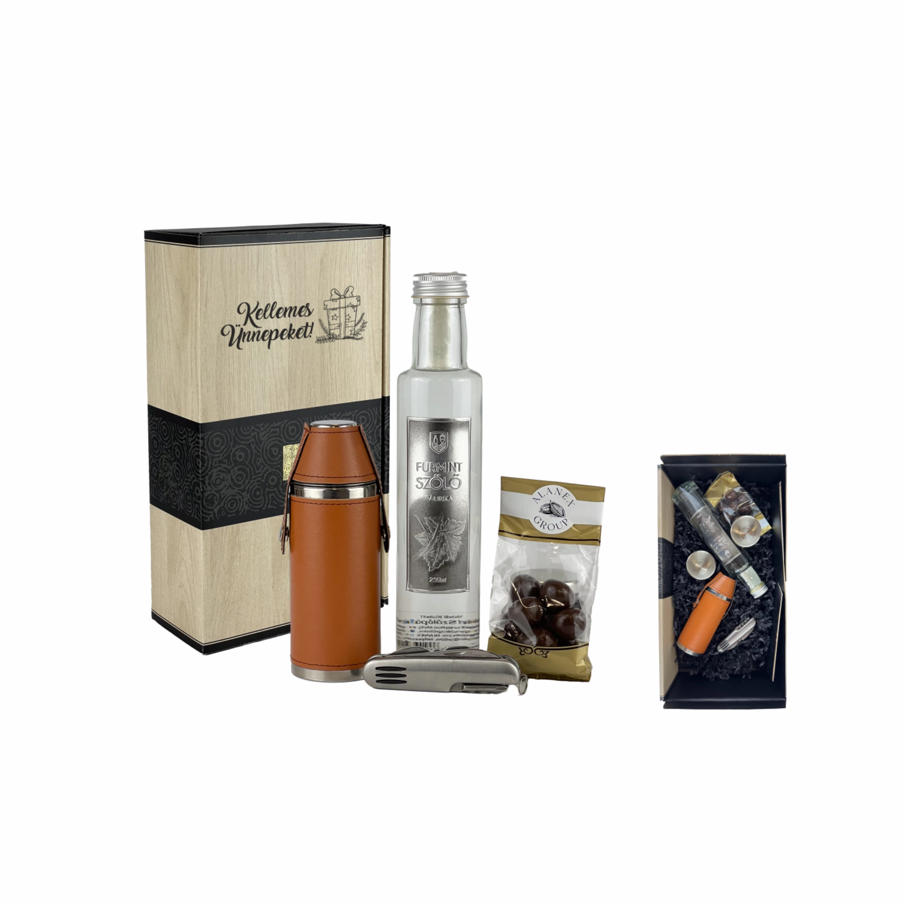 A csomag tartalma: Faerezetes papírdobozban, 0,25 l Furmint szőlő pálinka, rozsdamentes acél flaska műbőr bevonattal 230 ml, 2 darab fém kupica, 7 funkciós fém bicska, pálinkás bonbon csomag 60 g.