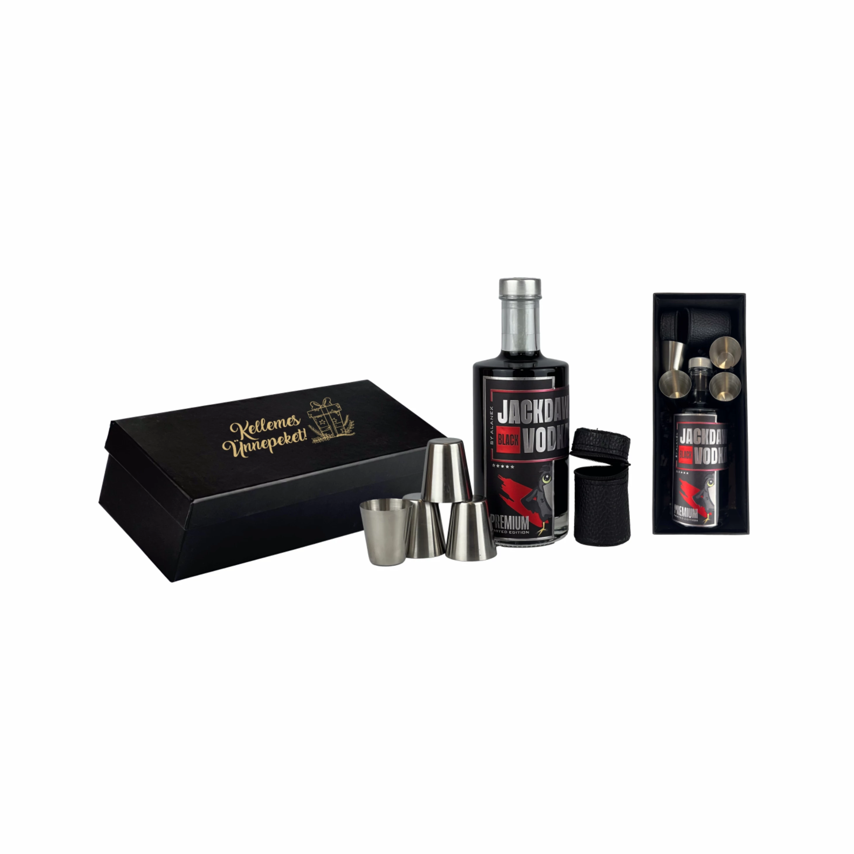 A csomag tartalma: Fekete papírdobozban, fekete Jackdaw vodka, 0,35 l, 4 db rozsdamentes fém kupica bőr tokban.